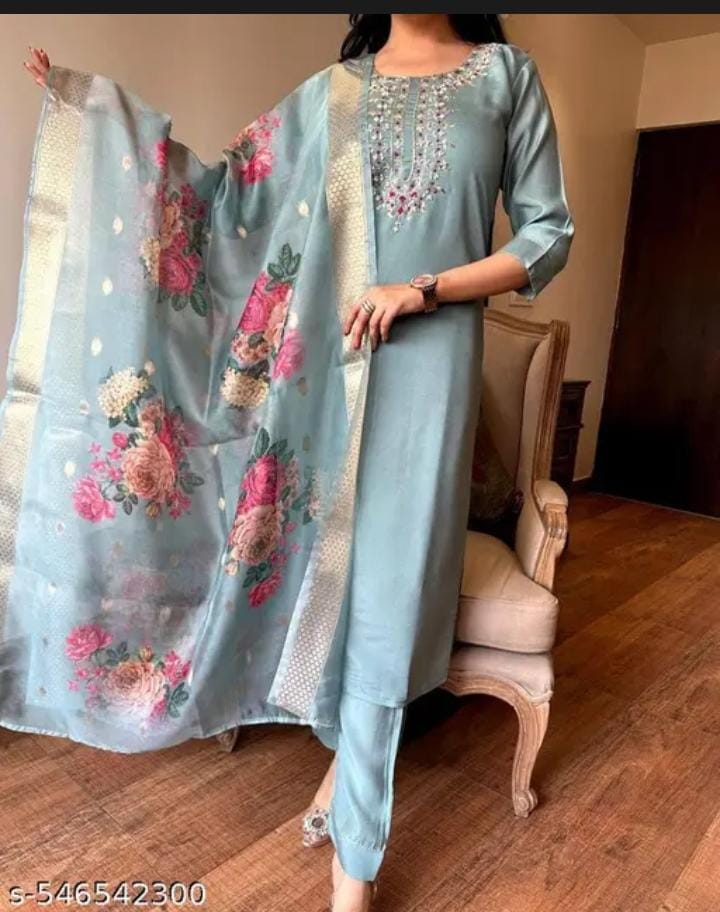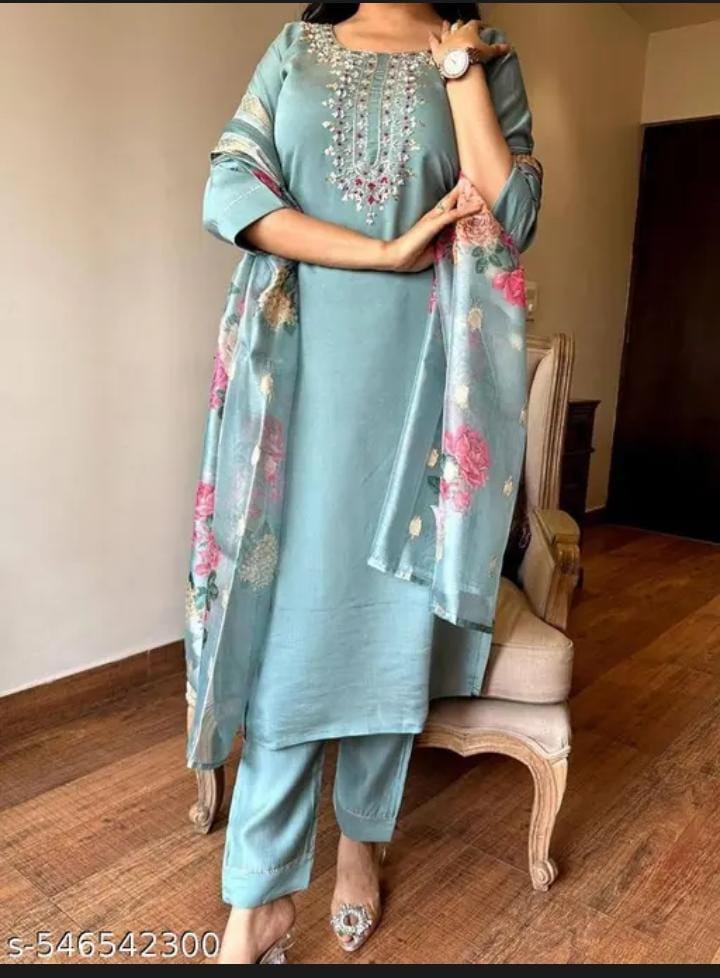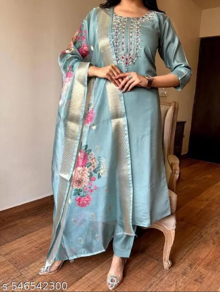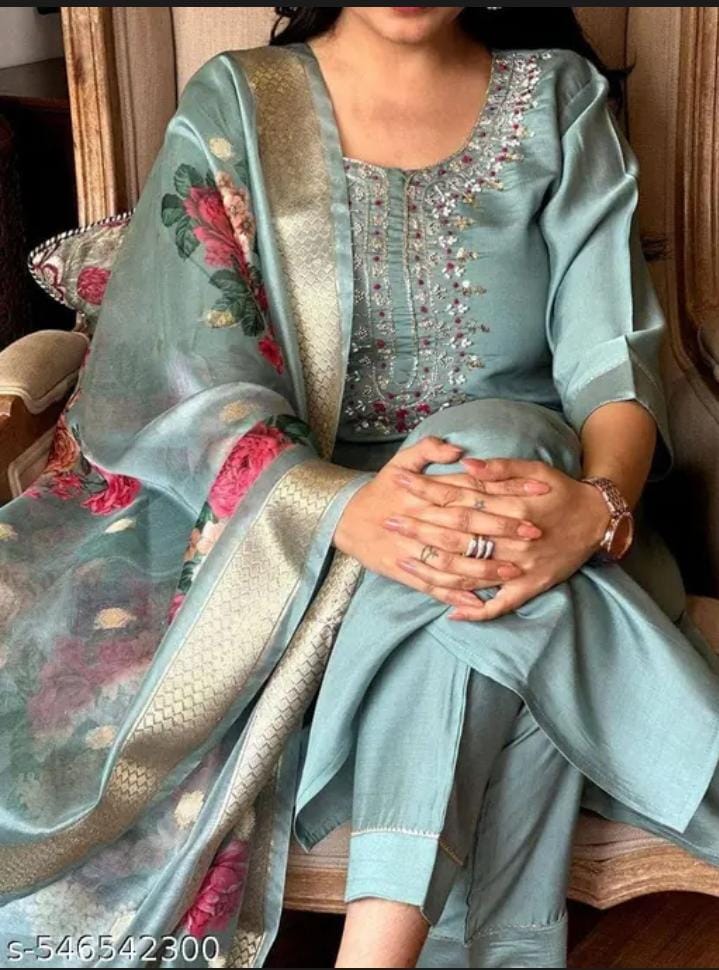 Women’s Attractive Olive Reyon Slub Embroidered Kurta Pant Dupatta Set